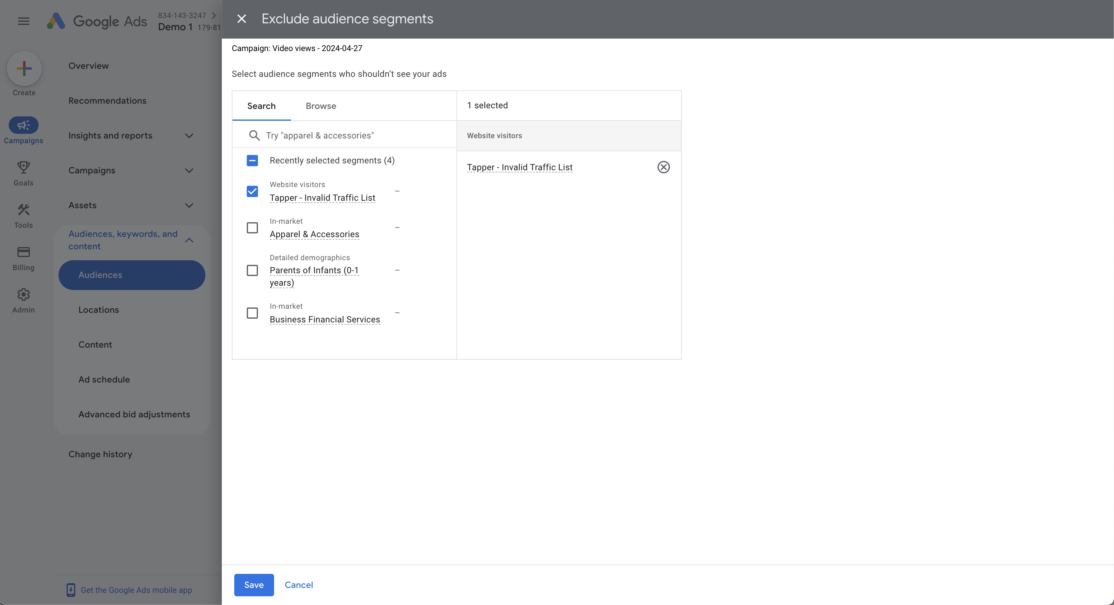 Choose Tapper - Invalid Traffic List from the available segments and click Save.